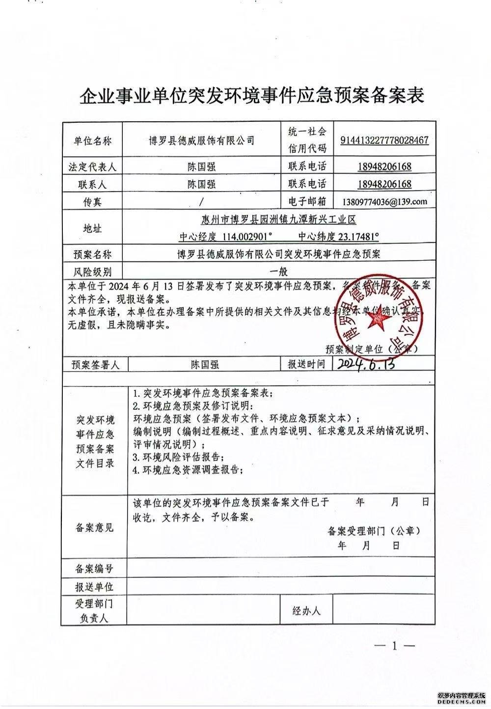 附件鏈接:《博羅縣德威服飾有限公司突發(fā)環(huán)境事件應(yīng)急預(yù)案備案登記表》